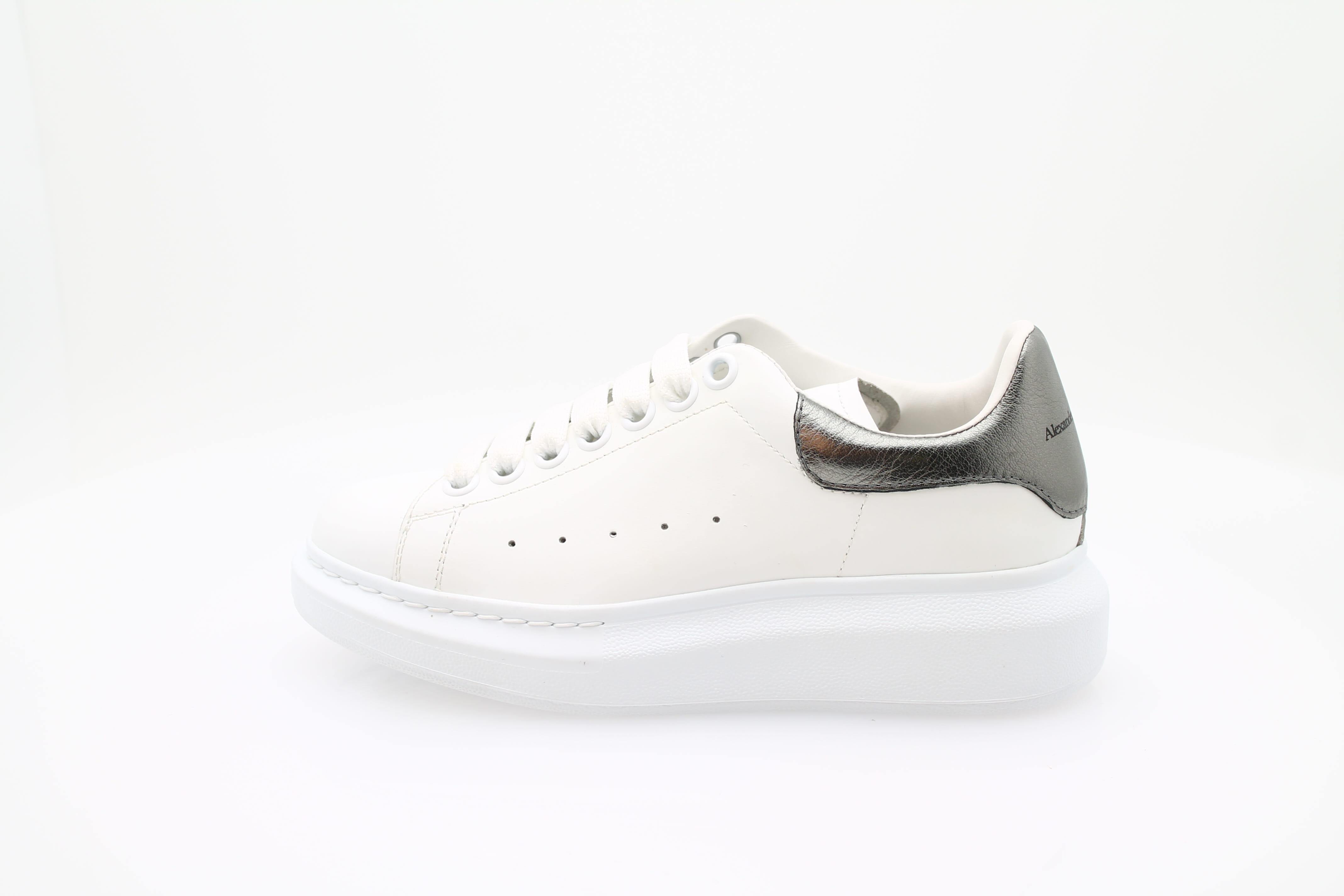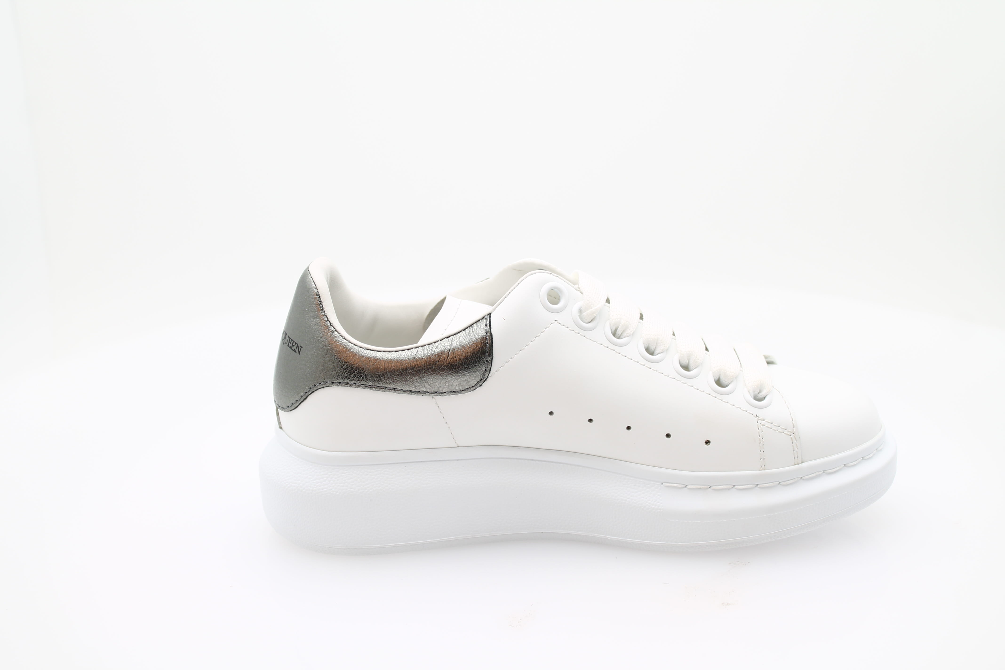 Sneaker à lacets Alexander McQueen en cuir blanc, élégante et confortable. Le talon est orné d’un motif gris, tandis que le nom de la marque est visible à l’arrière et sur la languette. Un modèle raffiné et facile à porter au quotidien.