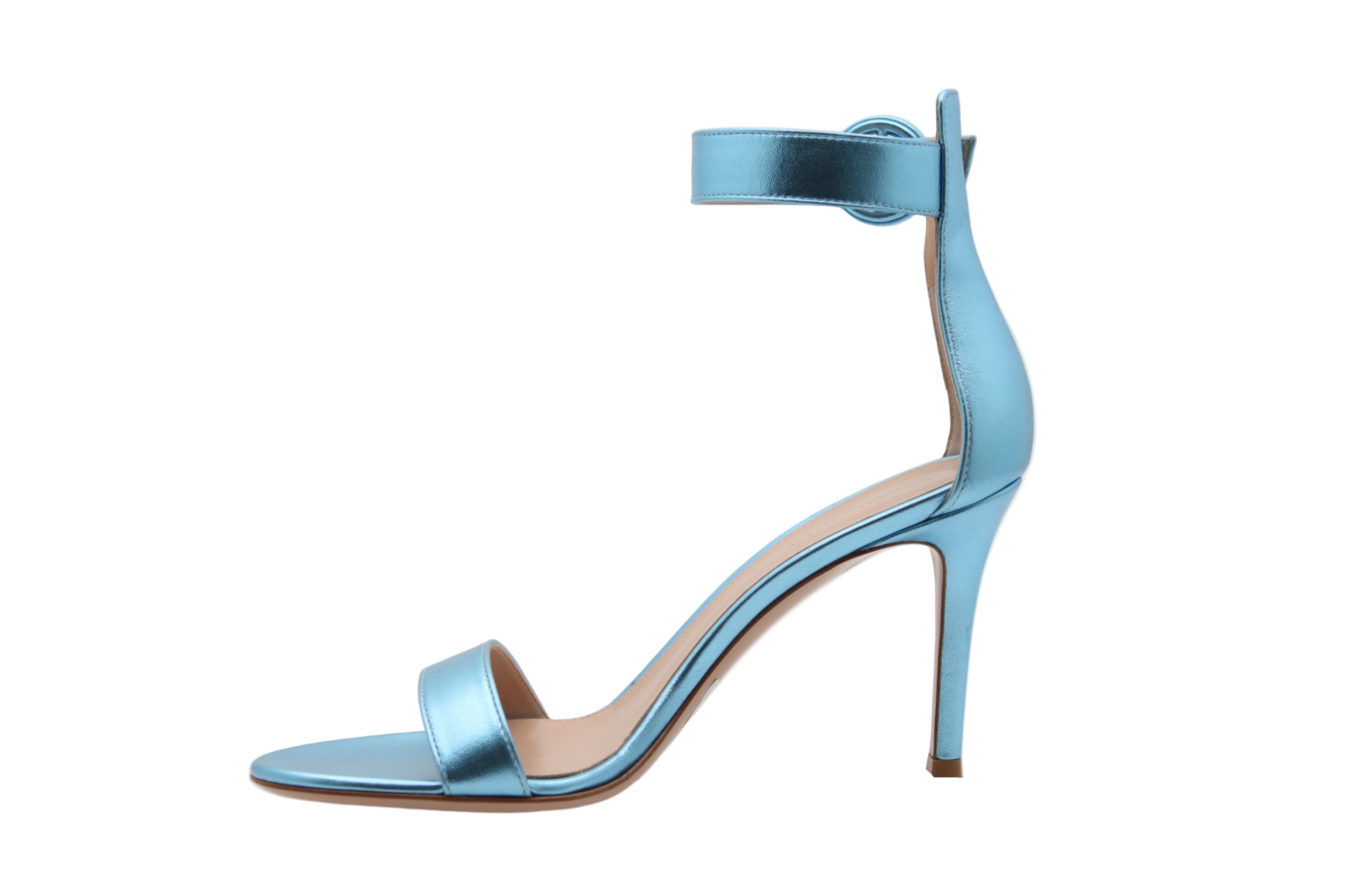 Symbole d’élégance et de féminité, la sandale Portofino 85 de Gianvito Rossi séduit par sa silhouette minimaliste et ses finitions d’exception. Réalisée en cuir métallisé bleu argenté, elle illumine chaque pas d’un éclat subtil et raffiné, fidèle au style iconique de la maison italienne.