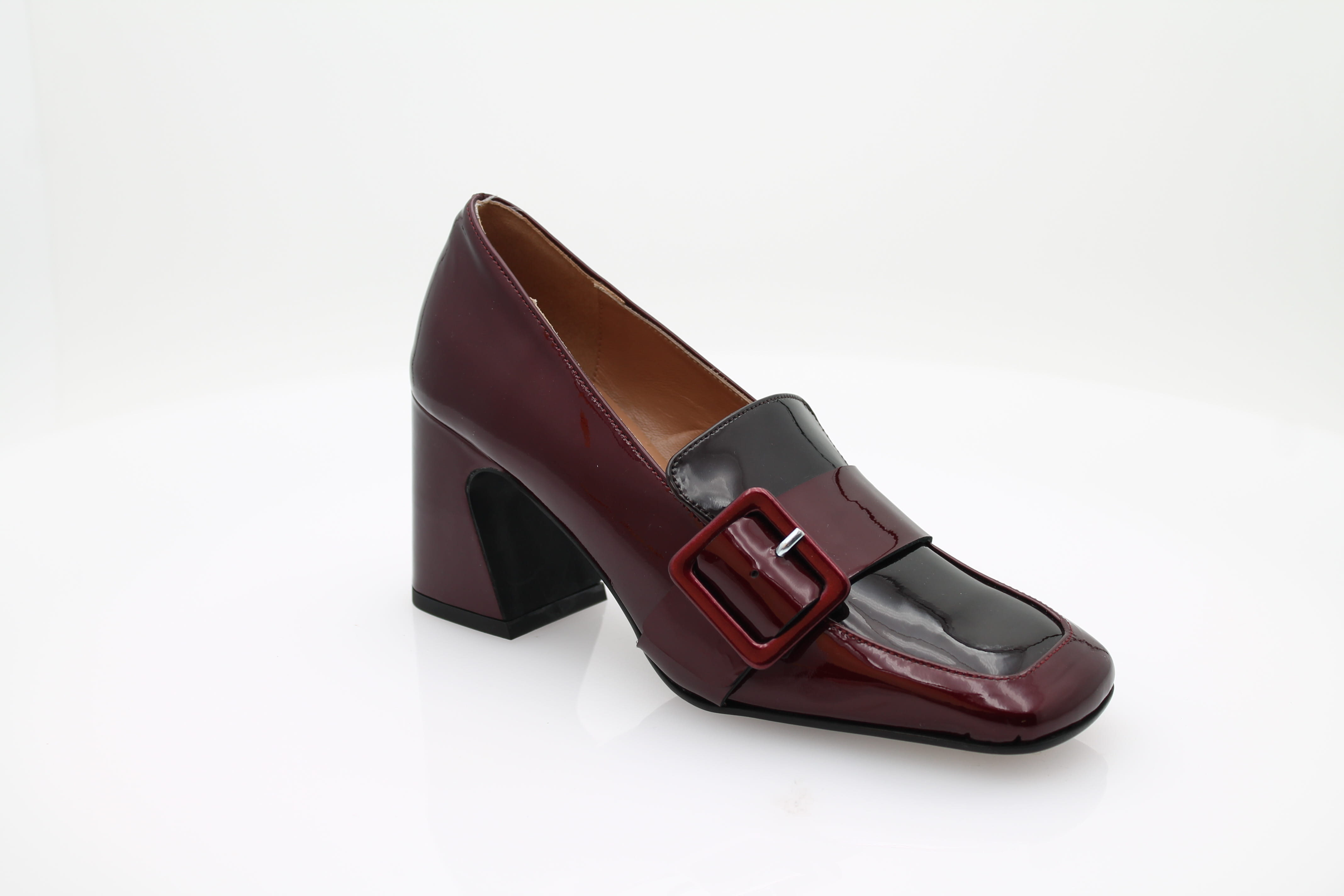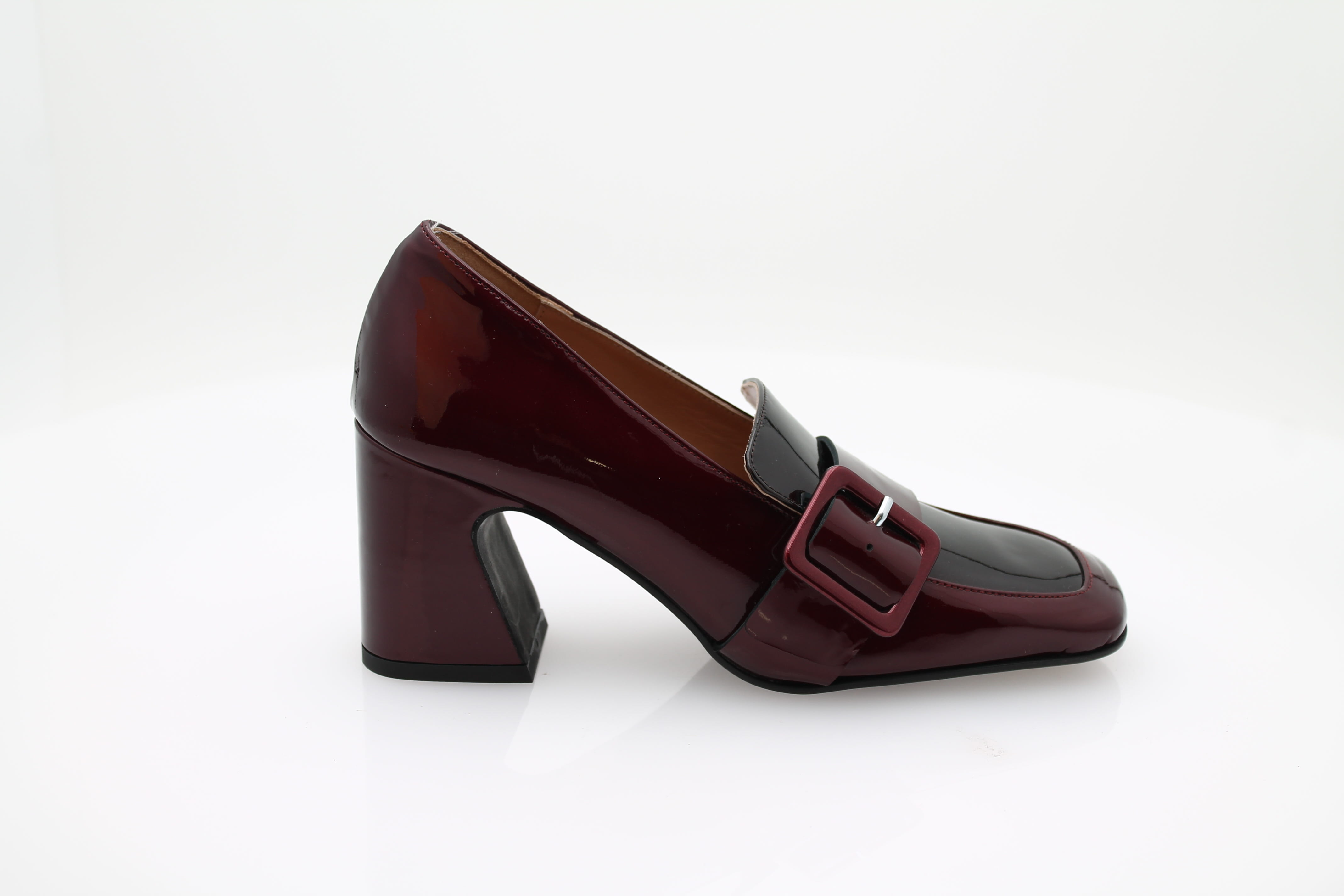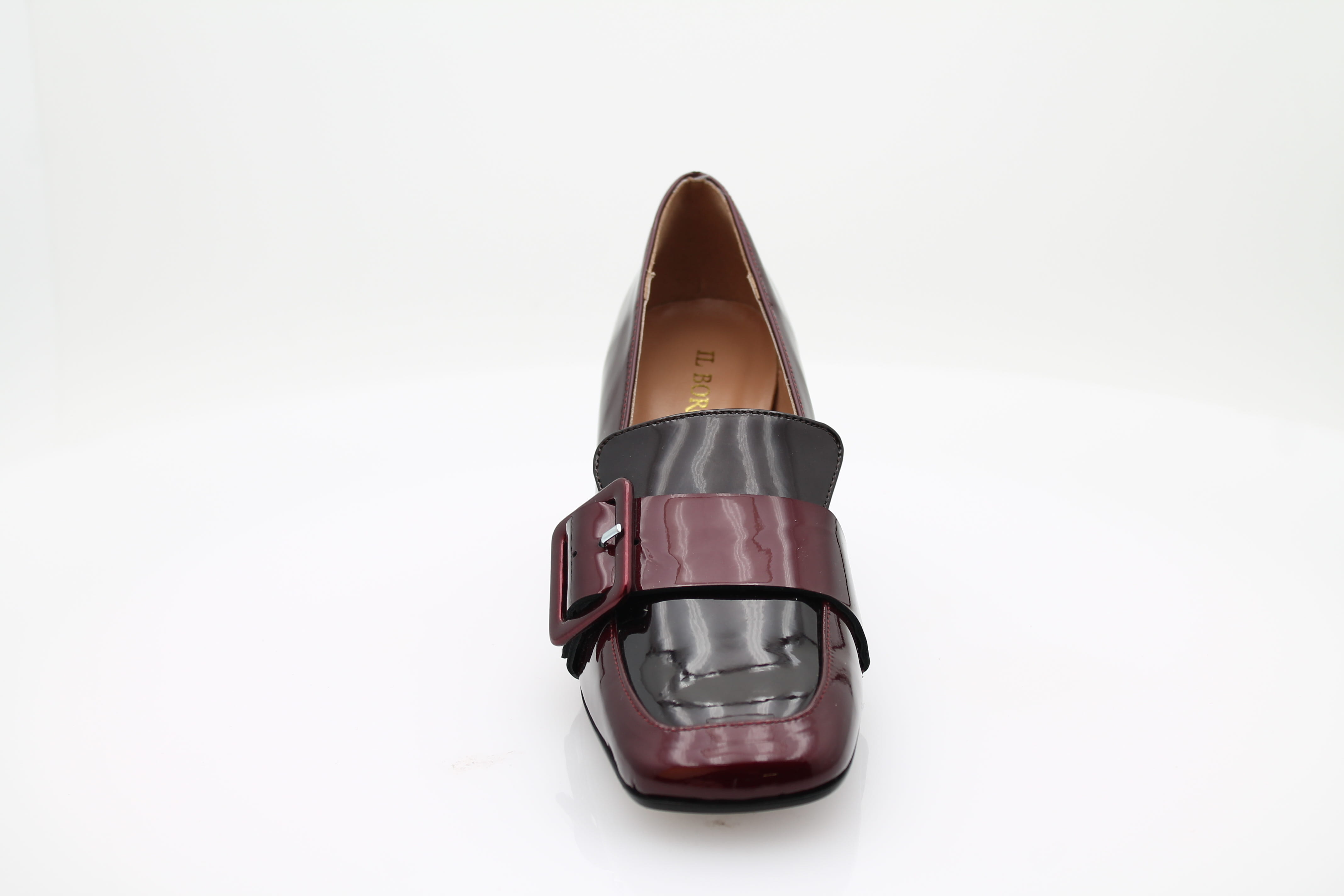 Découvrez nos mocassins à talons IL BORGO en cuir verni bordeaux, avec un bout carré et une boucle sur le côté pour une touche d'élégance.