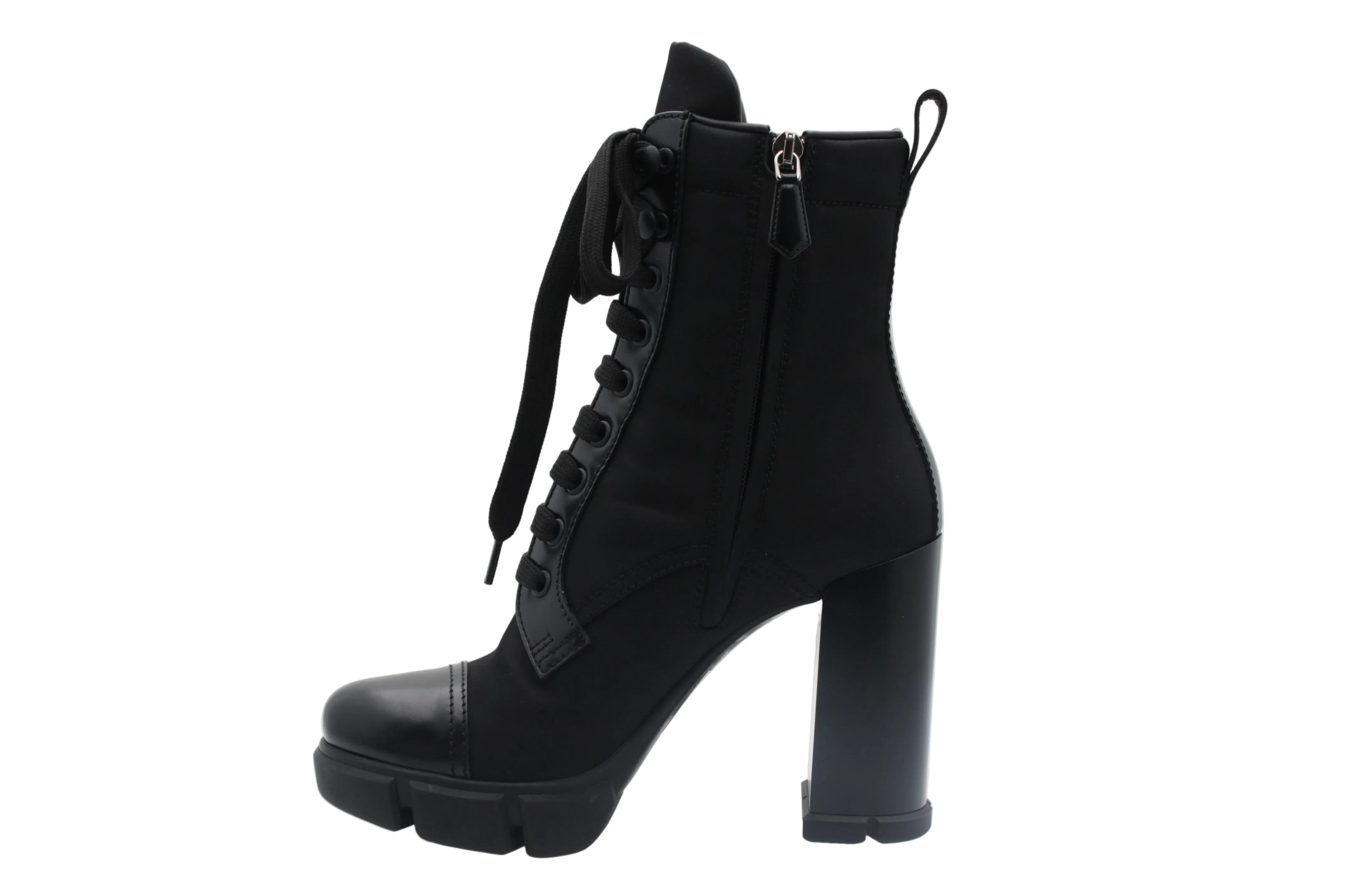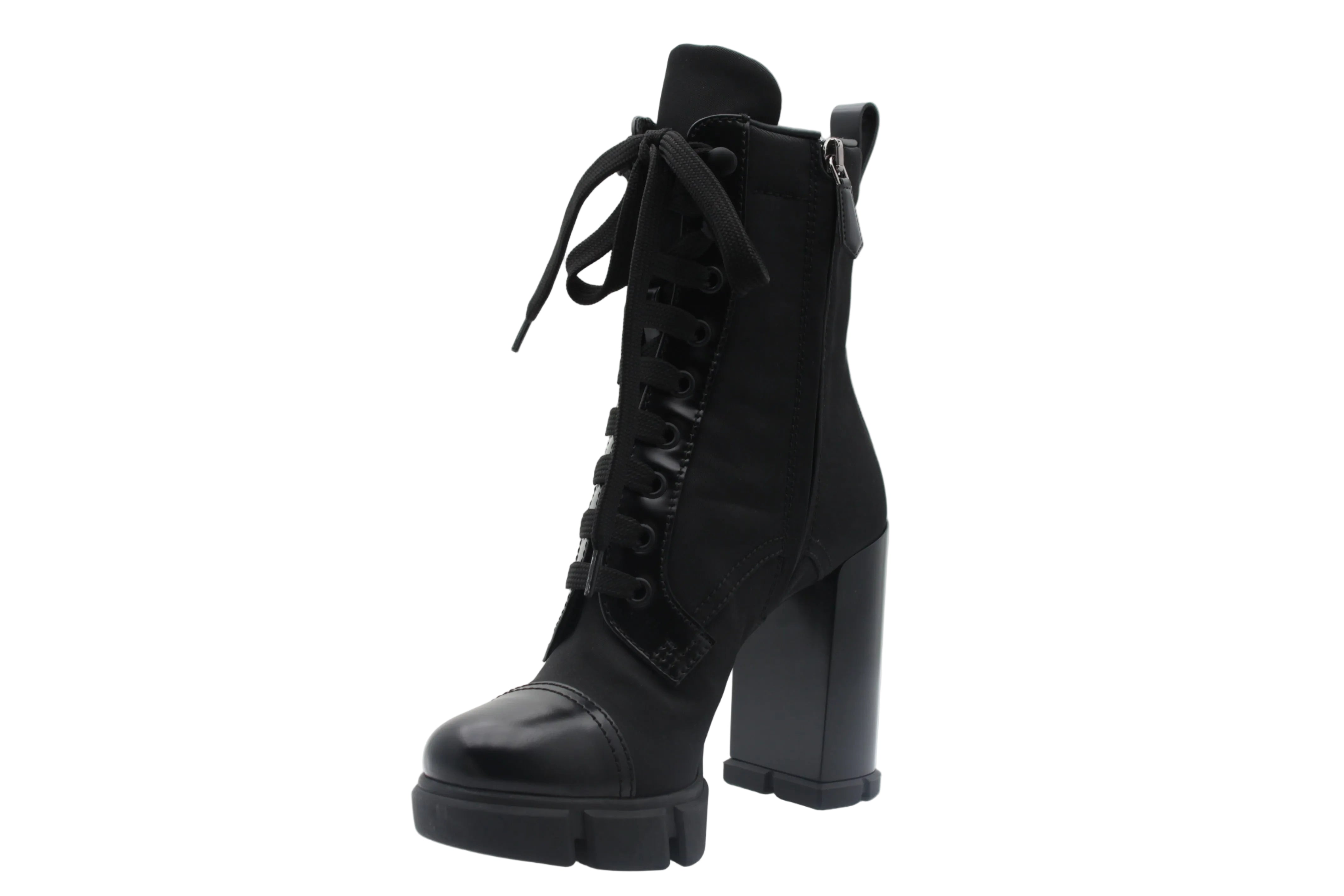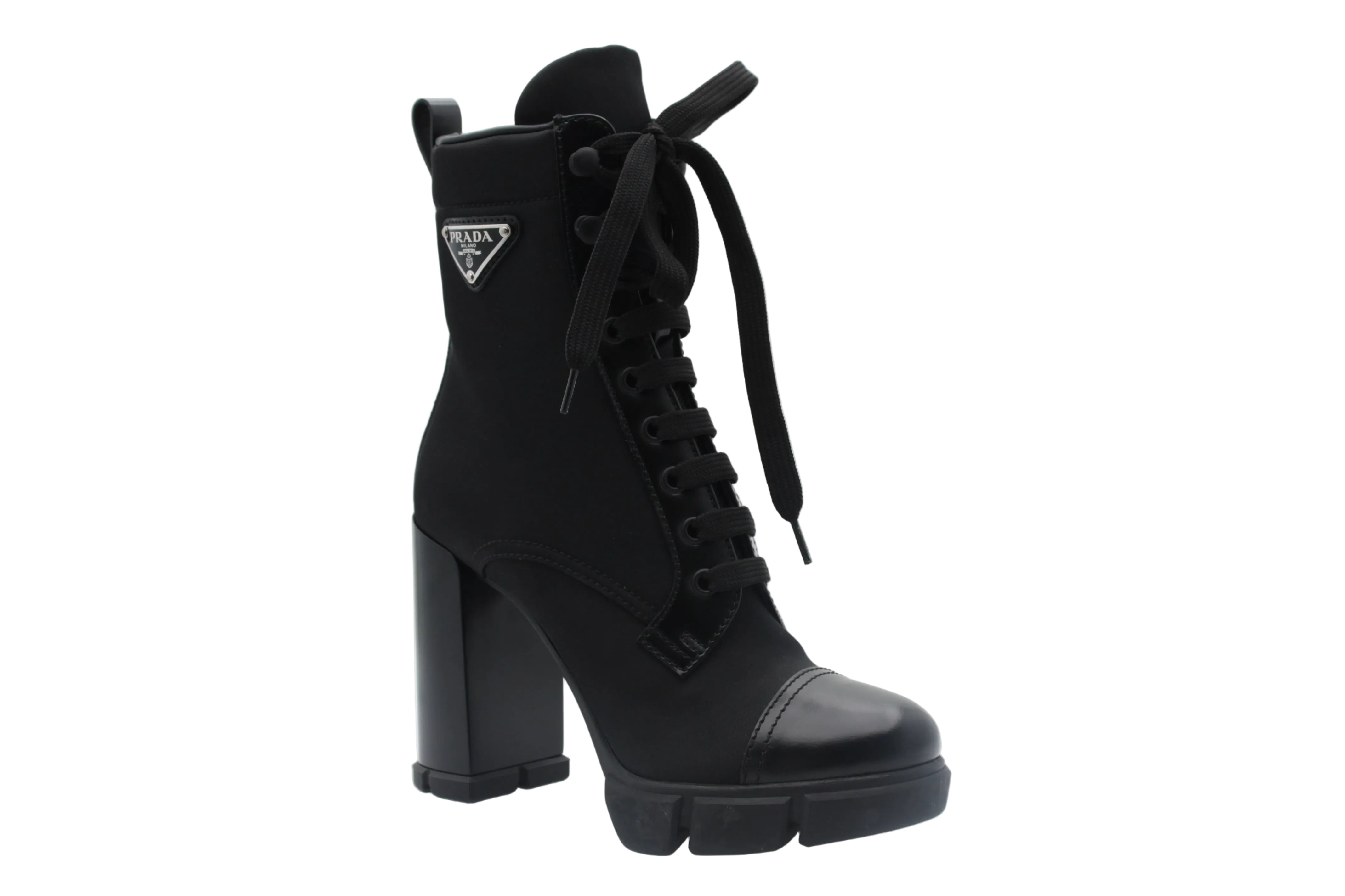 Bottines style combat Association nylon et cuir Talon épais Hauteur du talon : 11 cm Plateforme épaisse à l’avant Lacets frontaux Tirette latérale Logo Prada sur le côté Style urbain et statement
