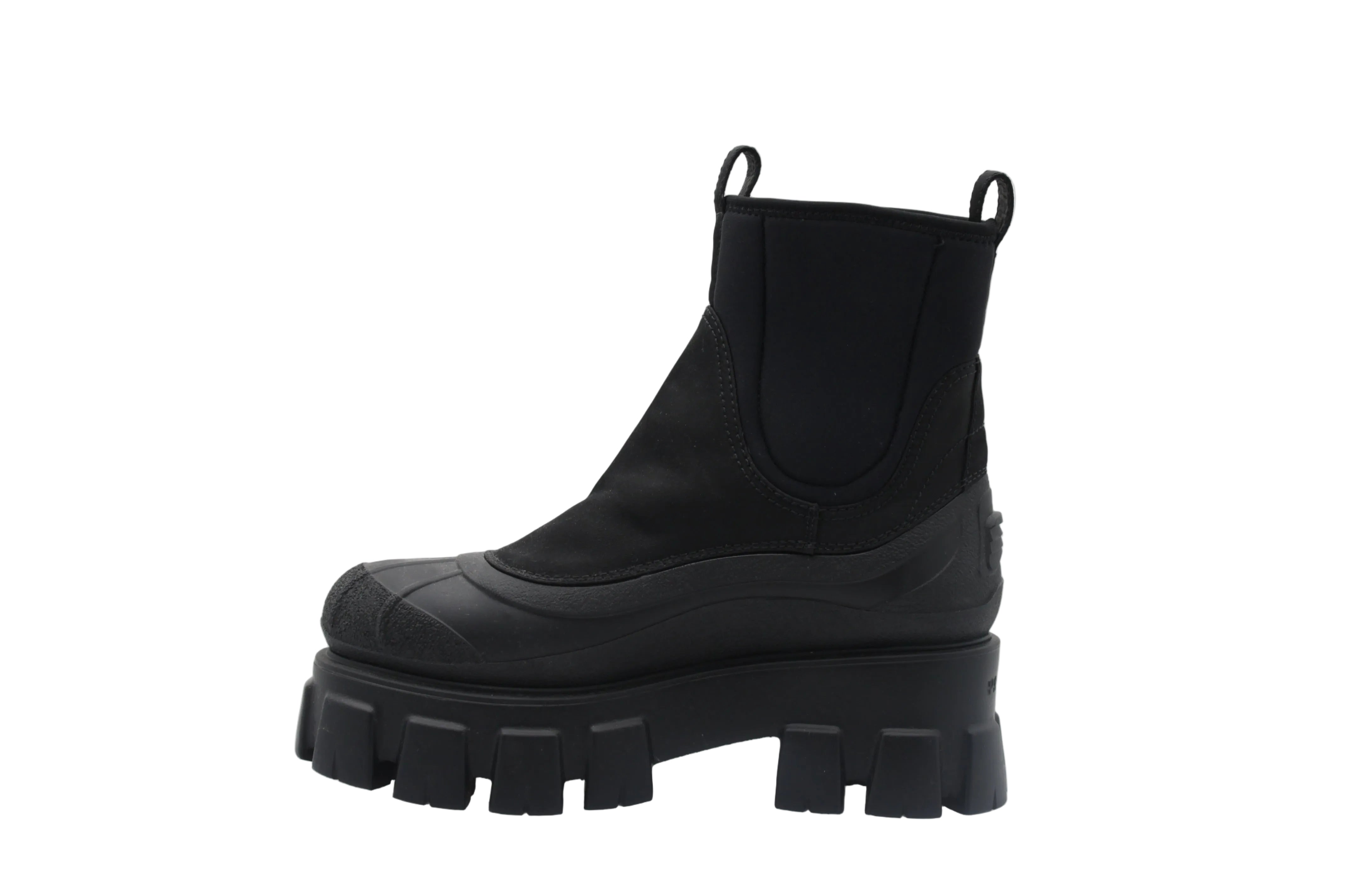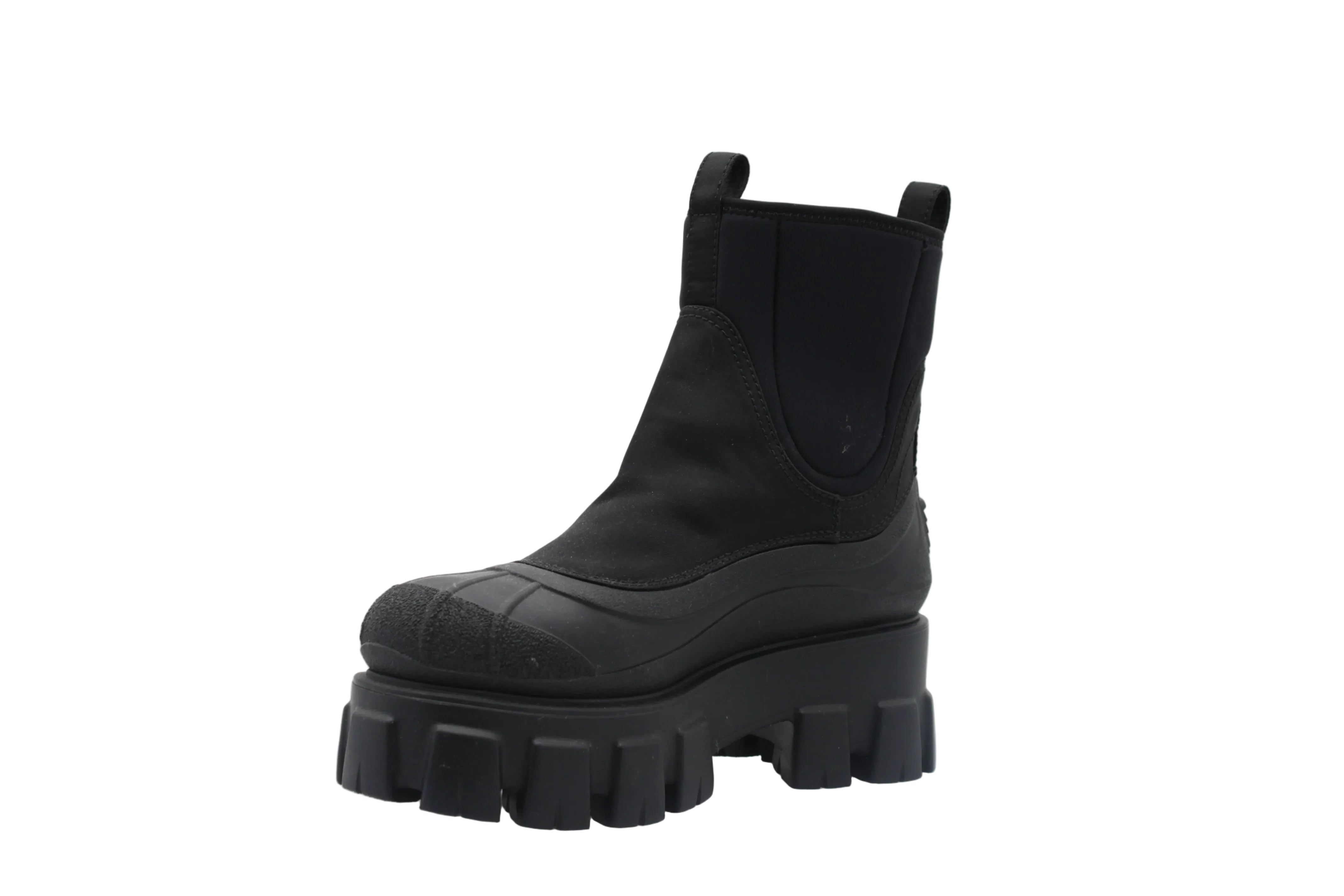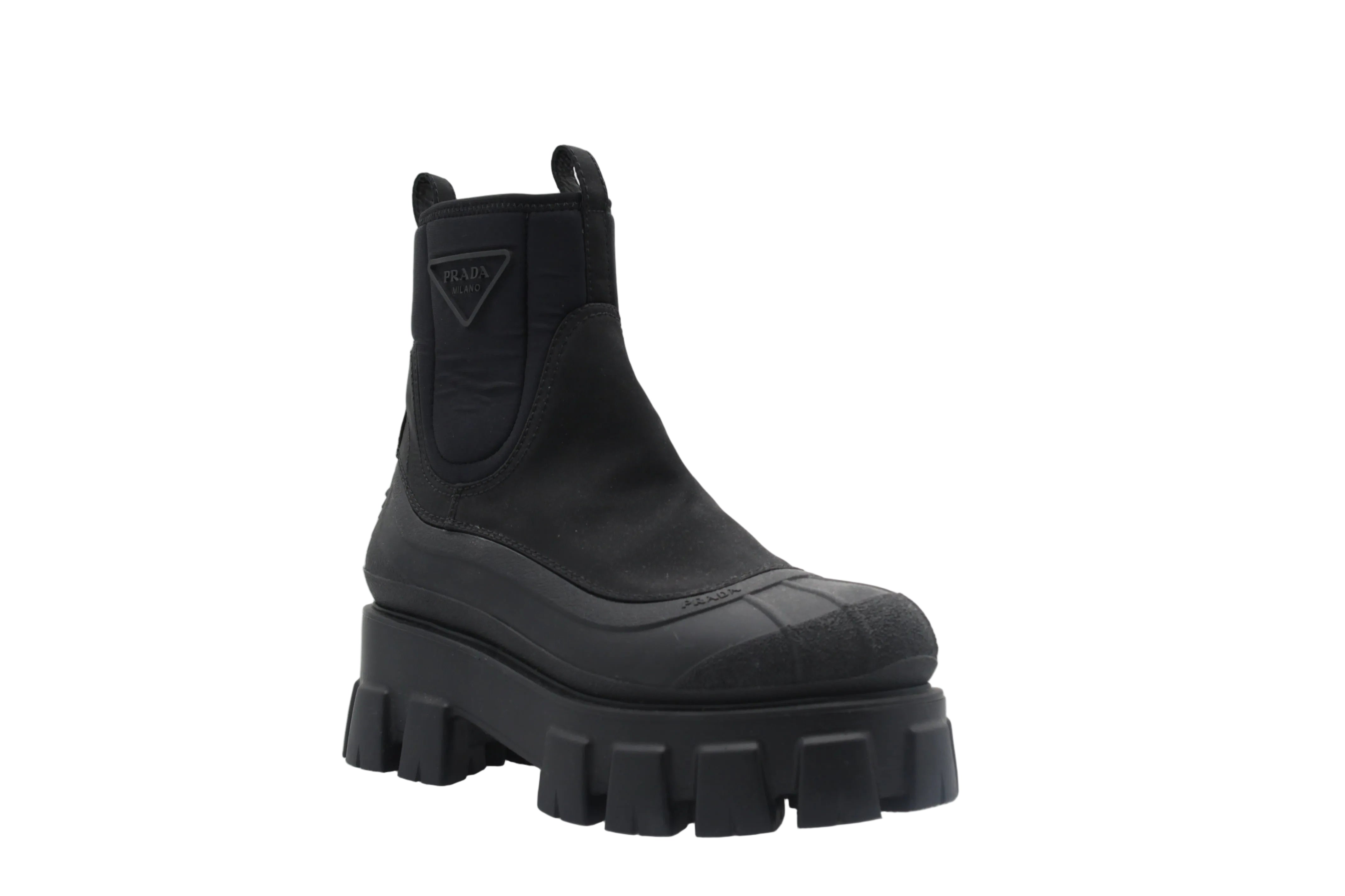 Bottines combat de luxe Mélange de cuir et nylon Lacets frontaux pour un maintien optimal Tirettes latérales pour un enfilage facile Plaque métallique Prada sur le côté Semelle épaisse crantée Talon bloc de 5,5 cm Style urbain et contemporain