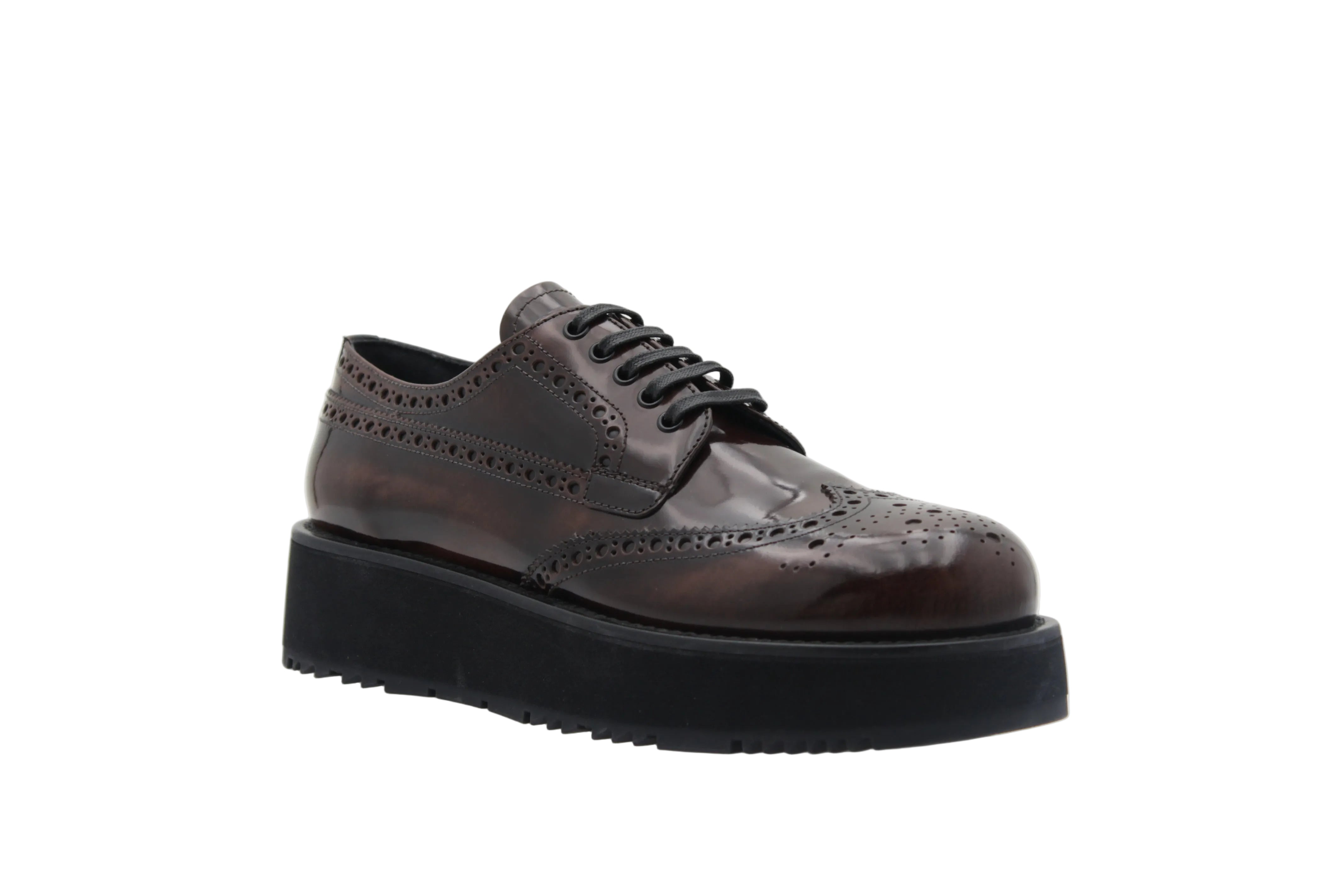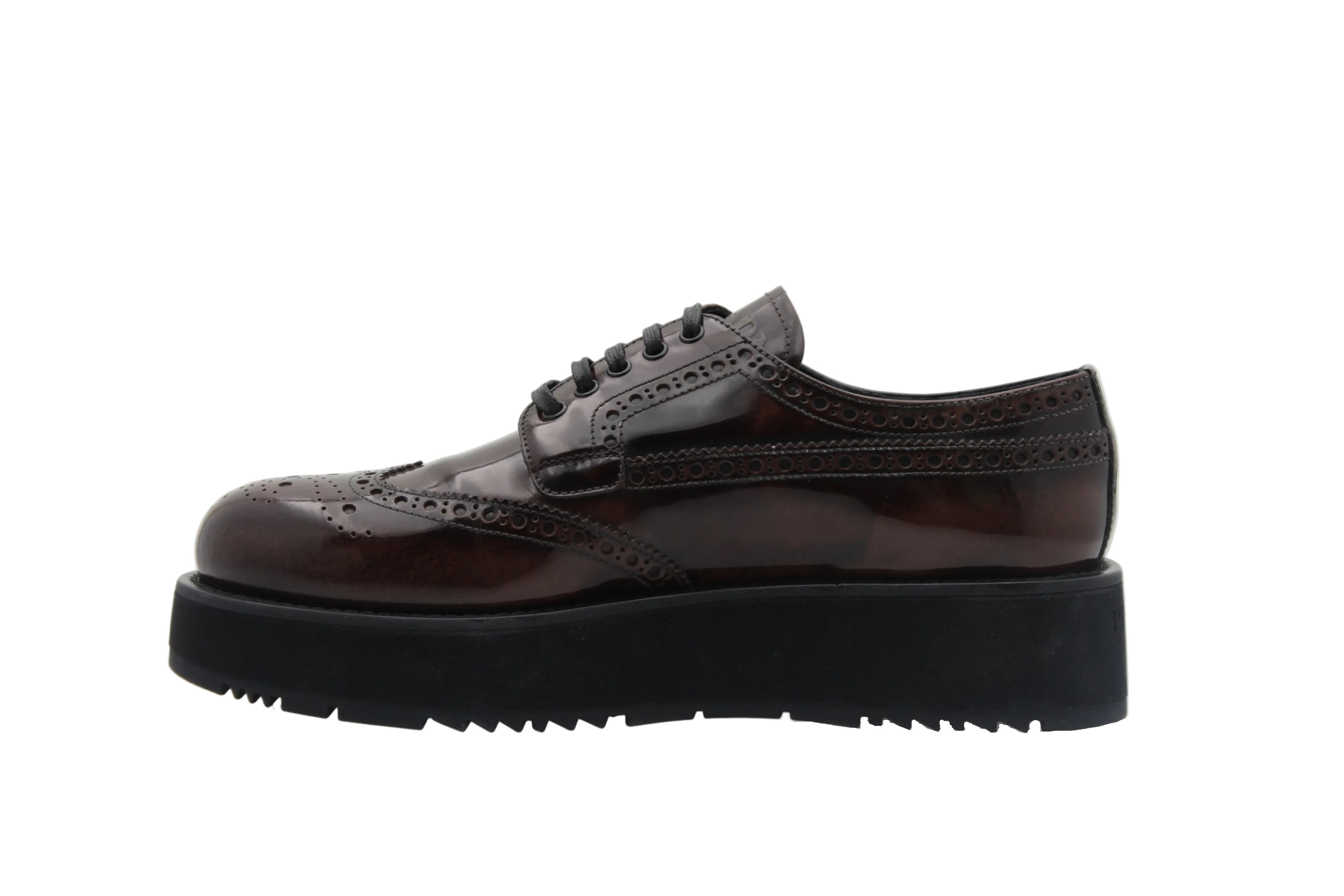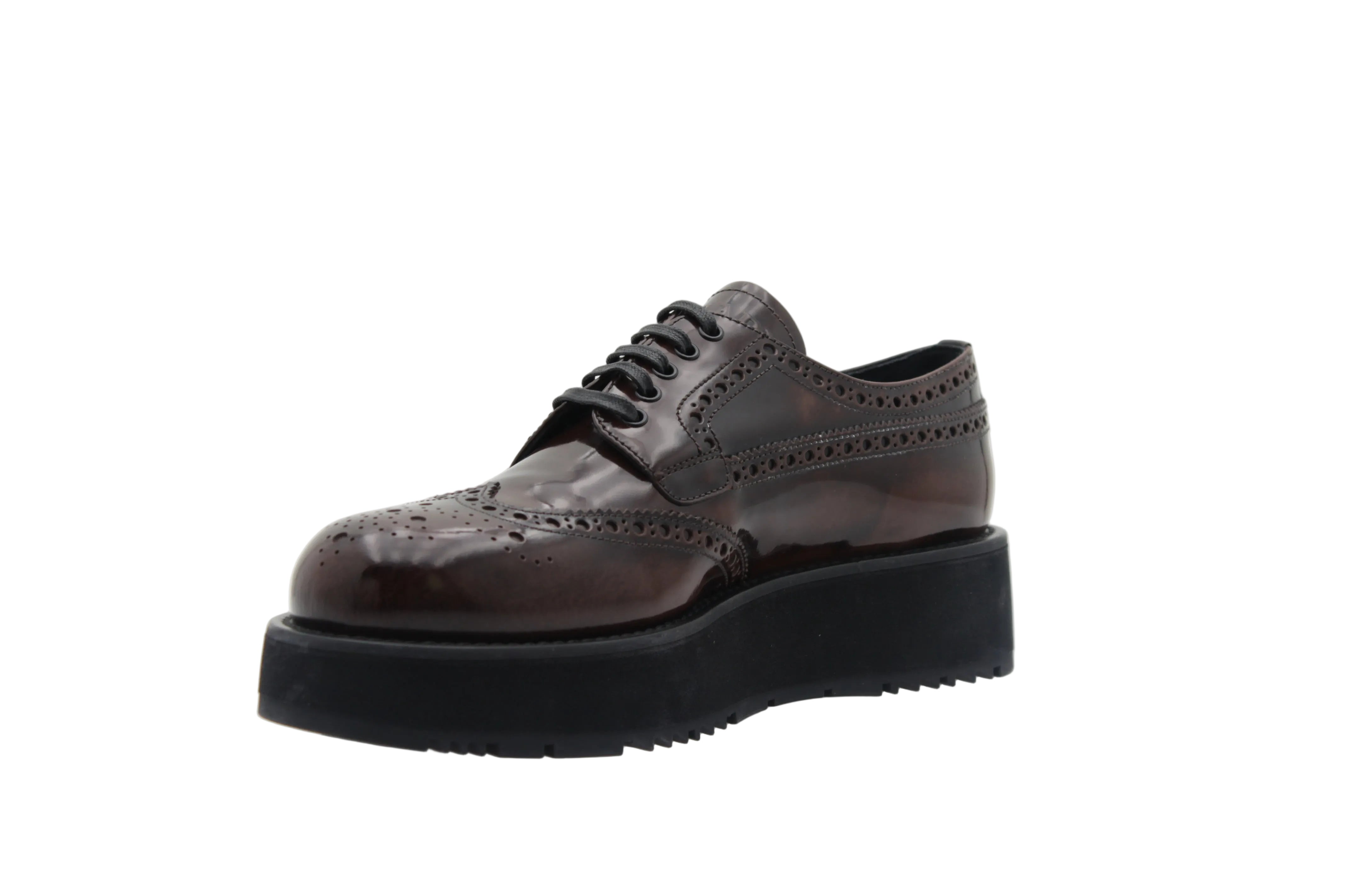 Chaussure type derby Style brogue avec perforations décoratives Cuir verni Fermeture à lacets Plateforme épaisse crantée Finition brillante Design structuré et moderne