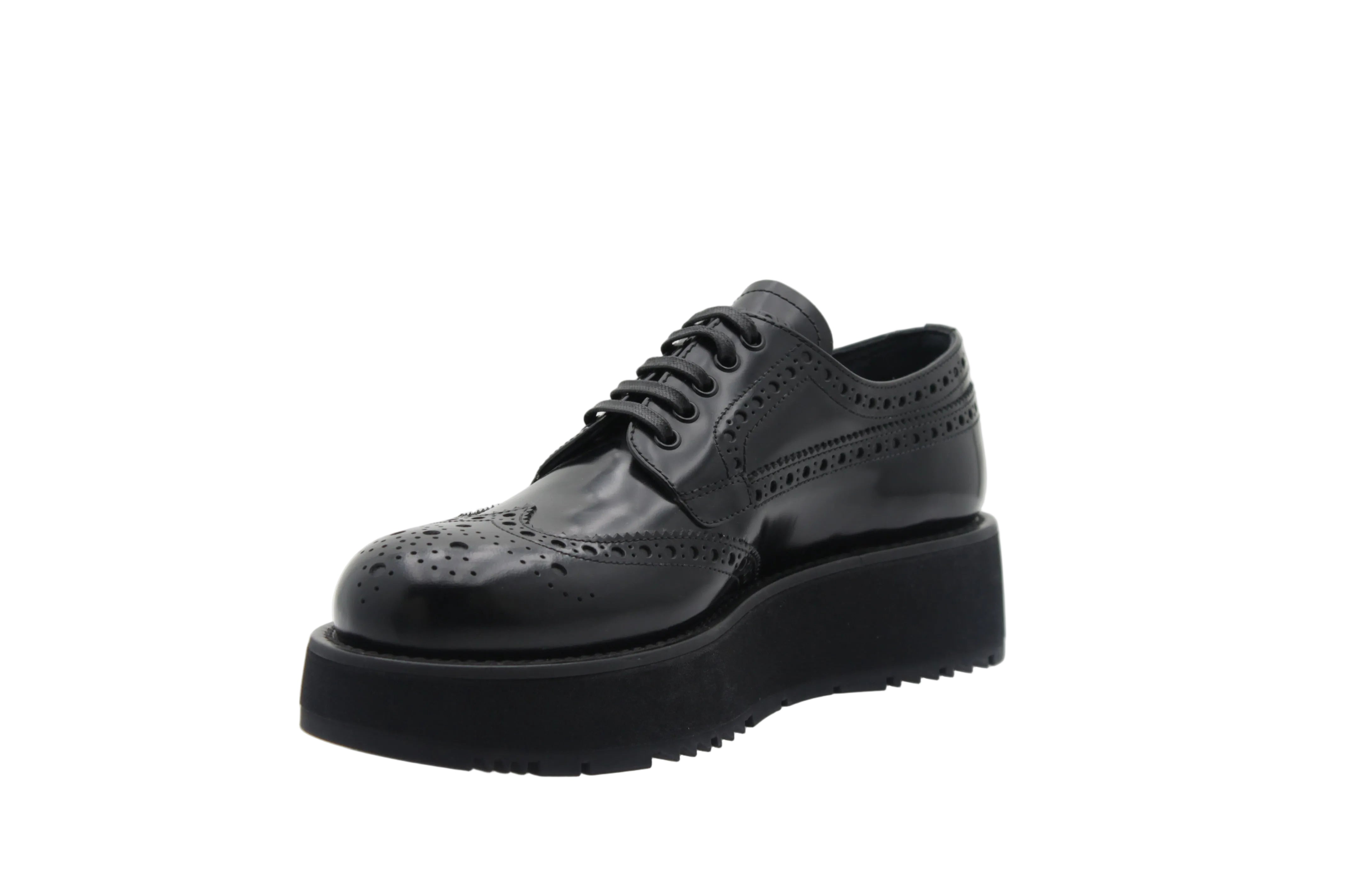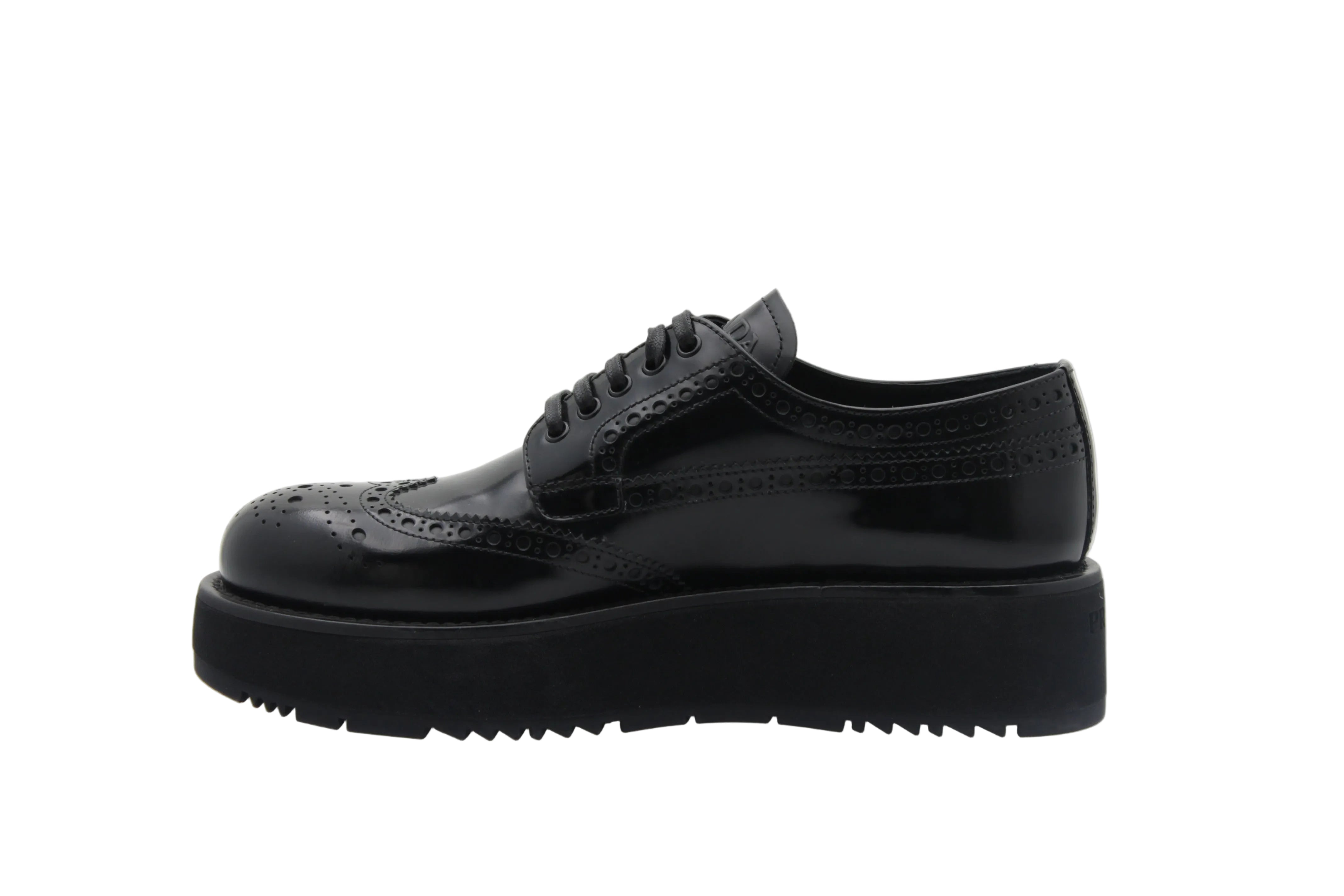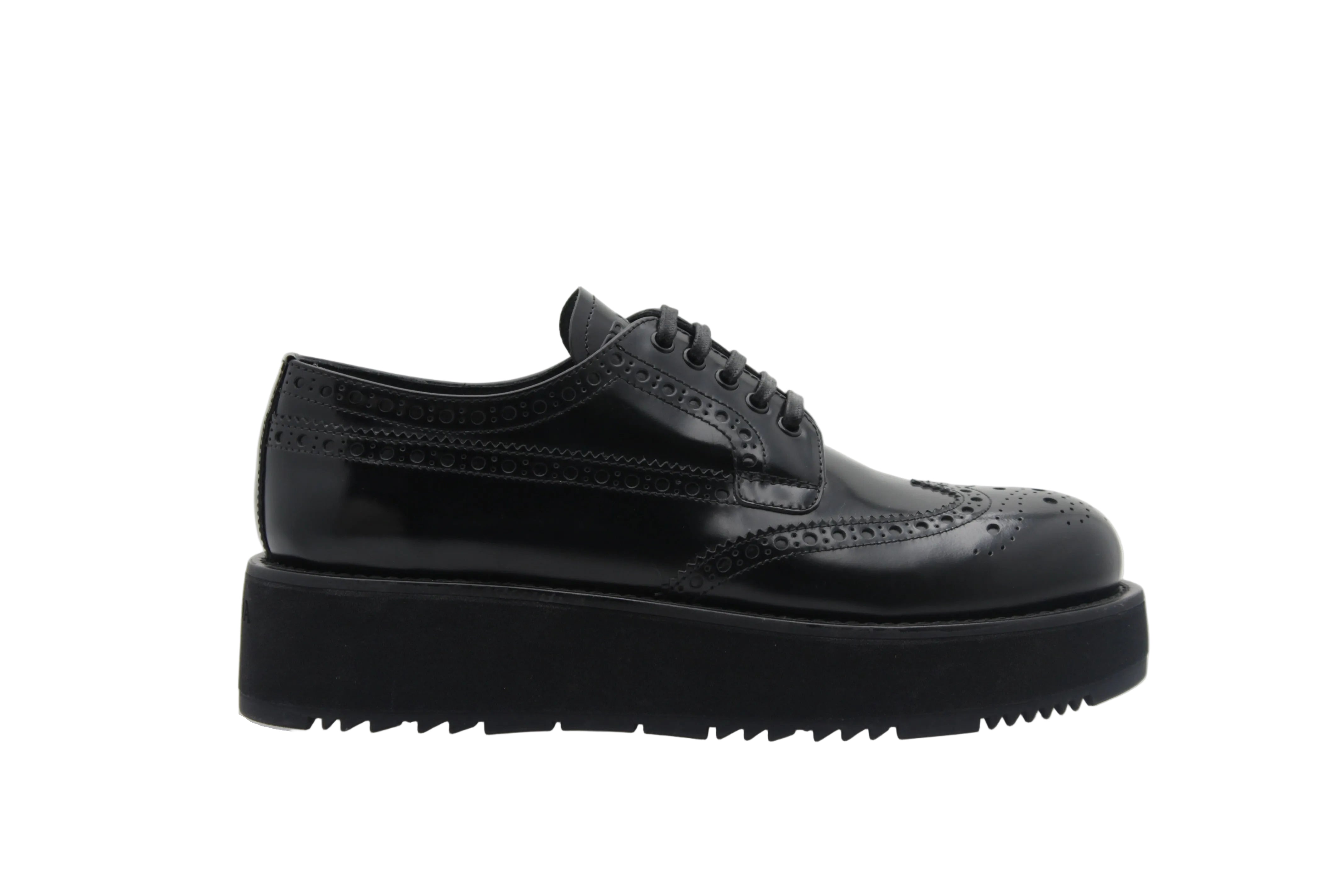 Prada Derby style brogue avec perforations décoratives Laçage classique Finition brillante en cuir verni Plateforme épaisse Design chic et contemporain Chaussure de luxe à inspiration masculine-féminine
