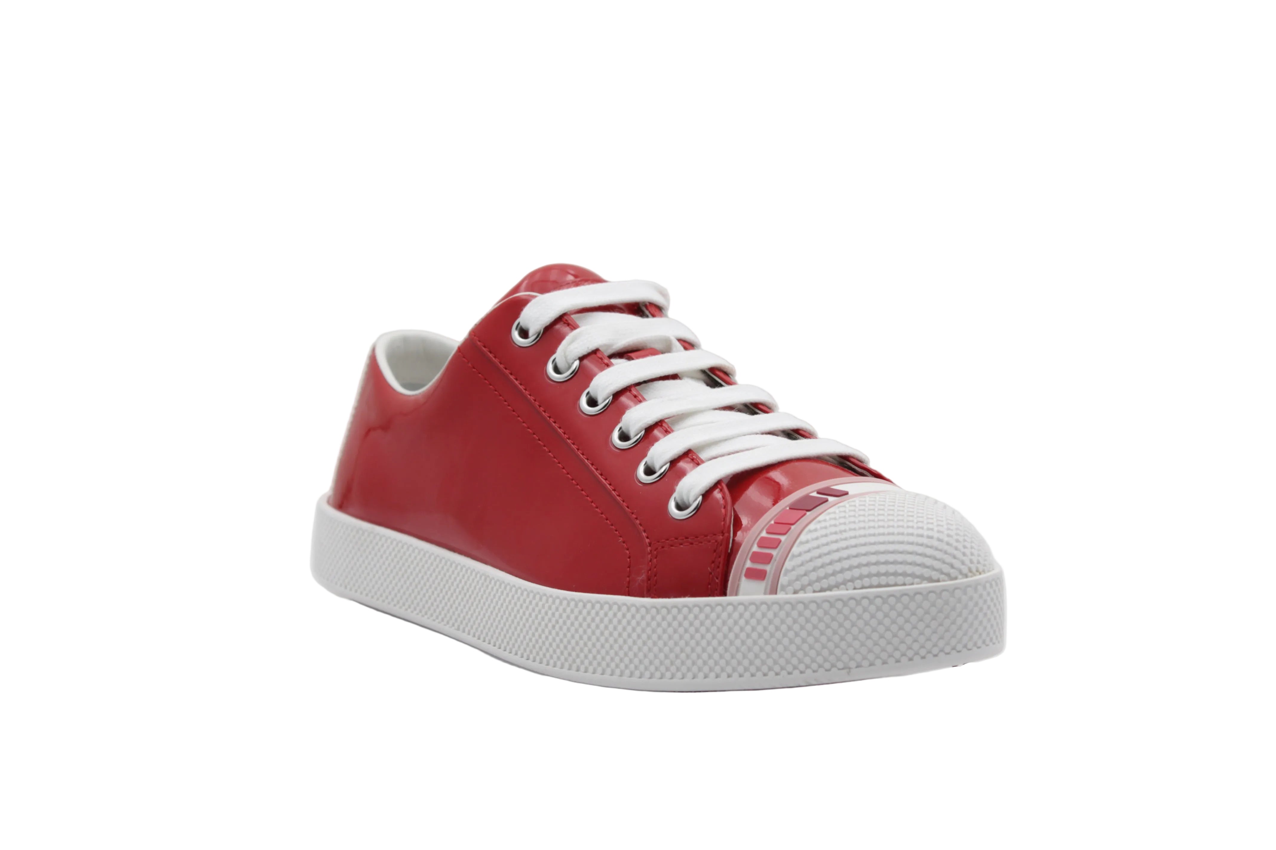 Sneaker basse en cuir verni rouge, fermeture à lacets, doublure intérieure en cuir, semelle caoutchouc ton sur ton, logo Prada embossé à l’arrière, bout arrondi renforcé, finitions premium.
