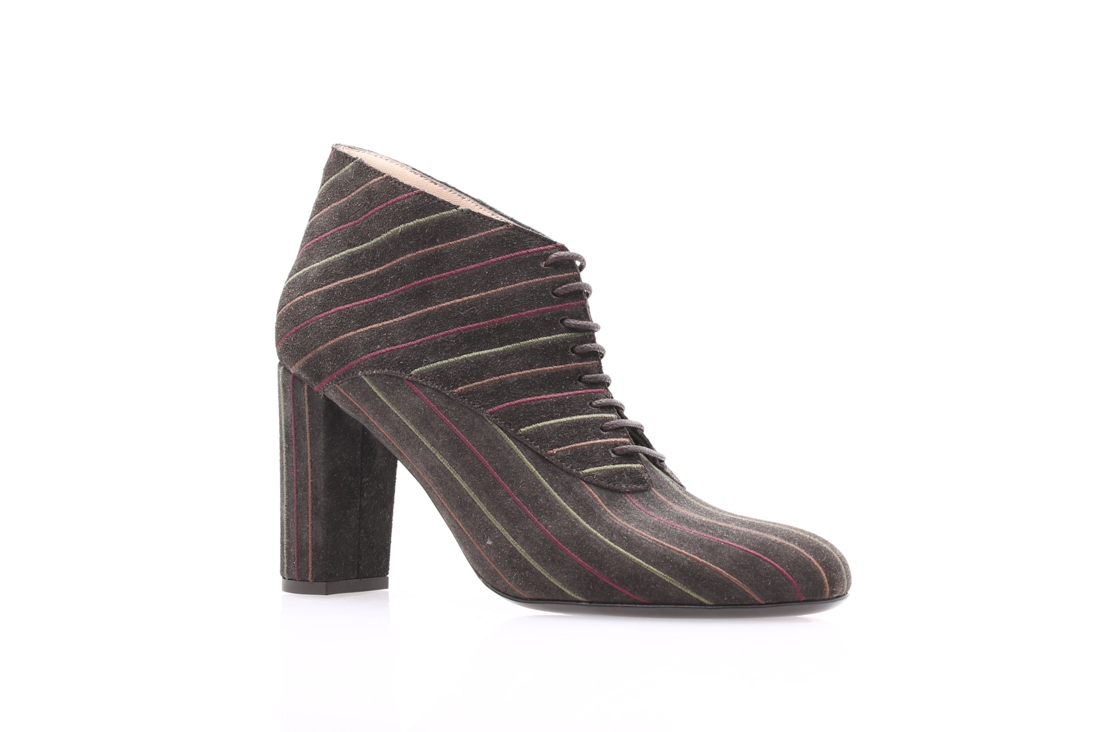 Ces bottines à lacets signées Sam Reychler revisitent le style rétro avec modernité. Confectionnées en cuir suédé à rayures multicolores, elles allient originalité et raffinement. Leur silhouette structurée et le jeu graphique des rayures verticales et obliques allongent visuellement la jambe tout en apportant une touche d’audace maîtrisée.