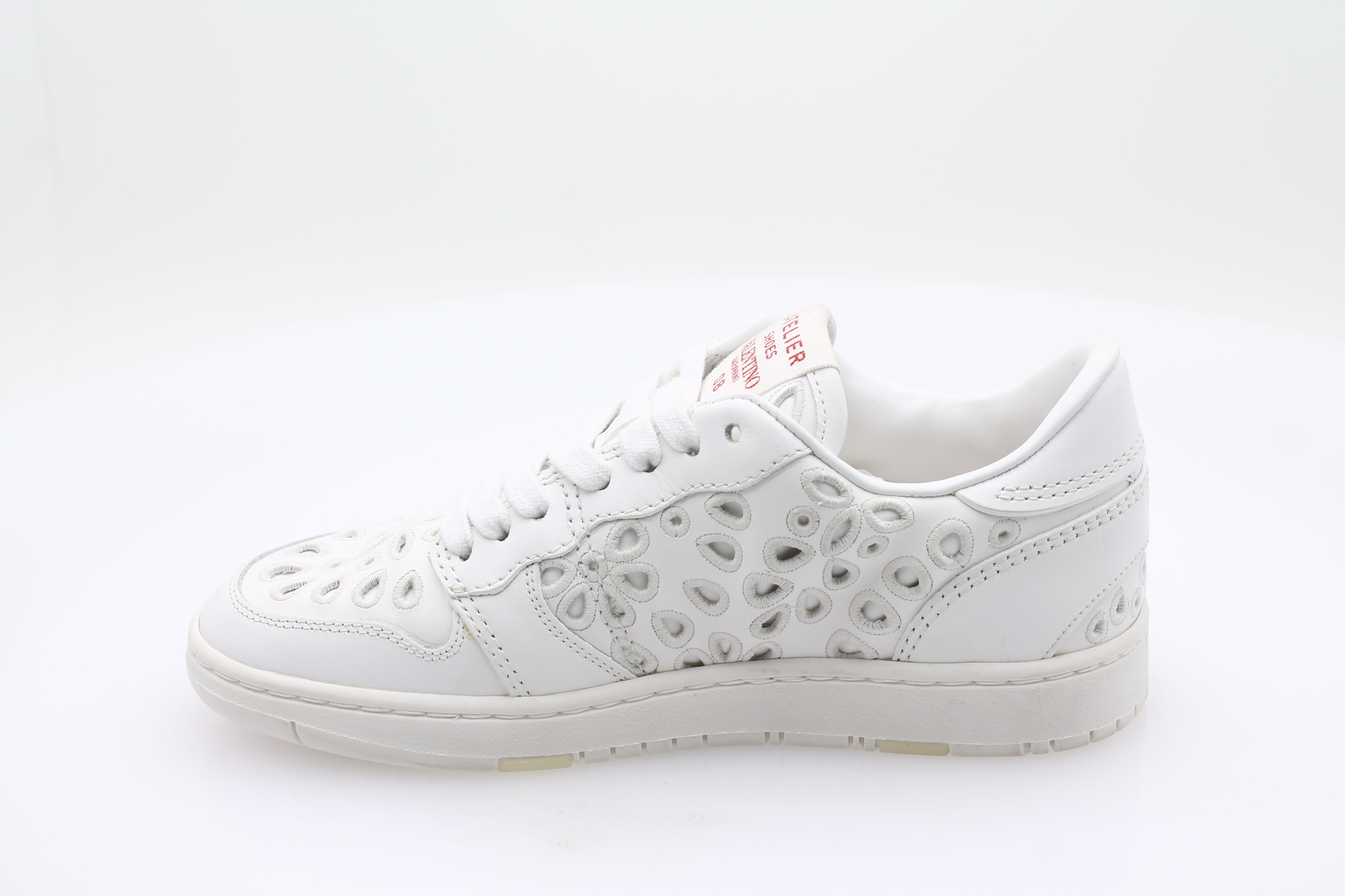 Fabriquée en cuir blanc de haute qualité, elle présente une écriture rouge audacieuse et des détails perforés pour un look unique.