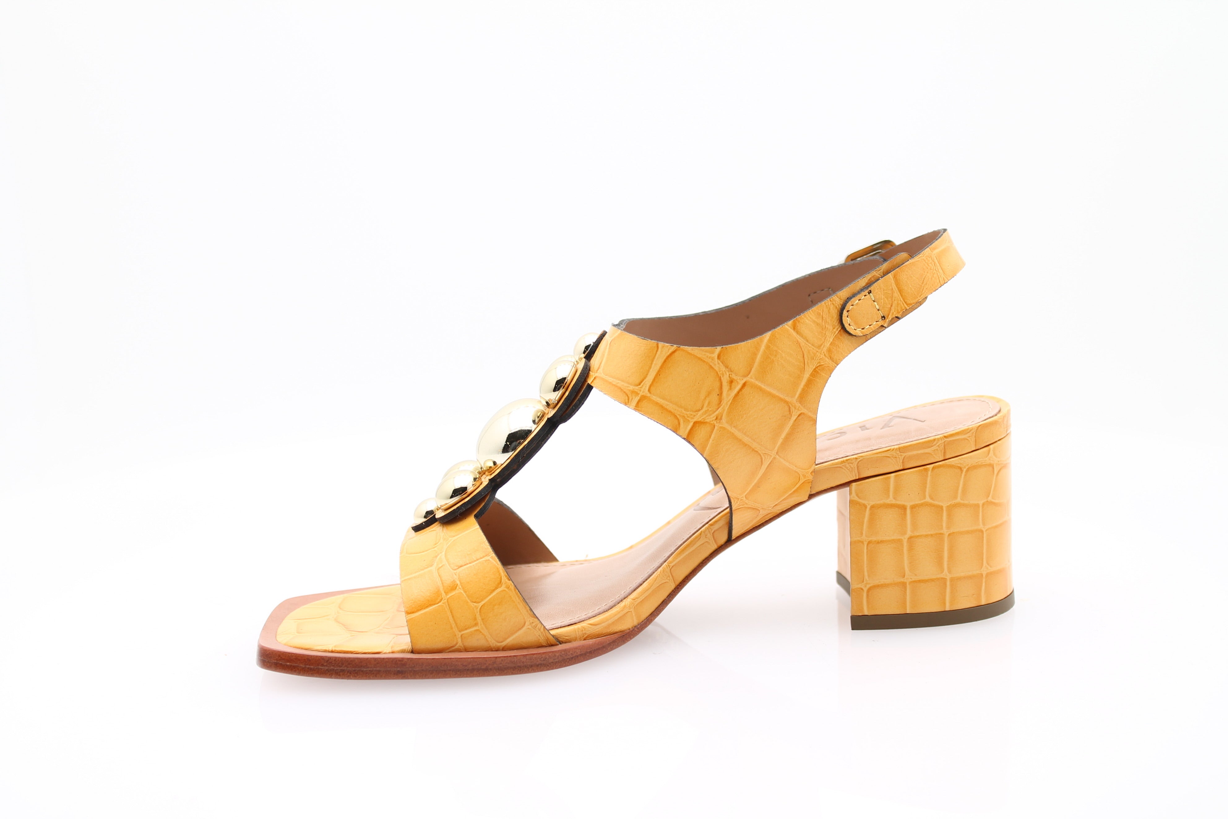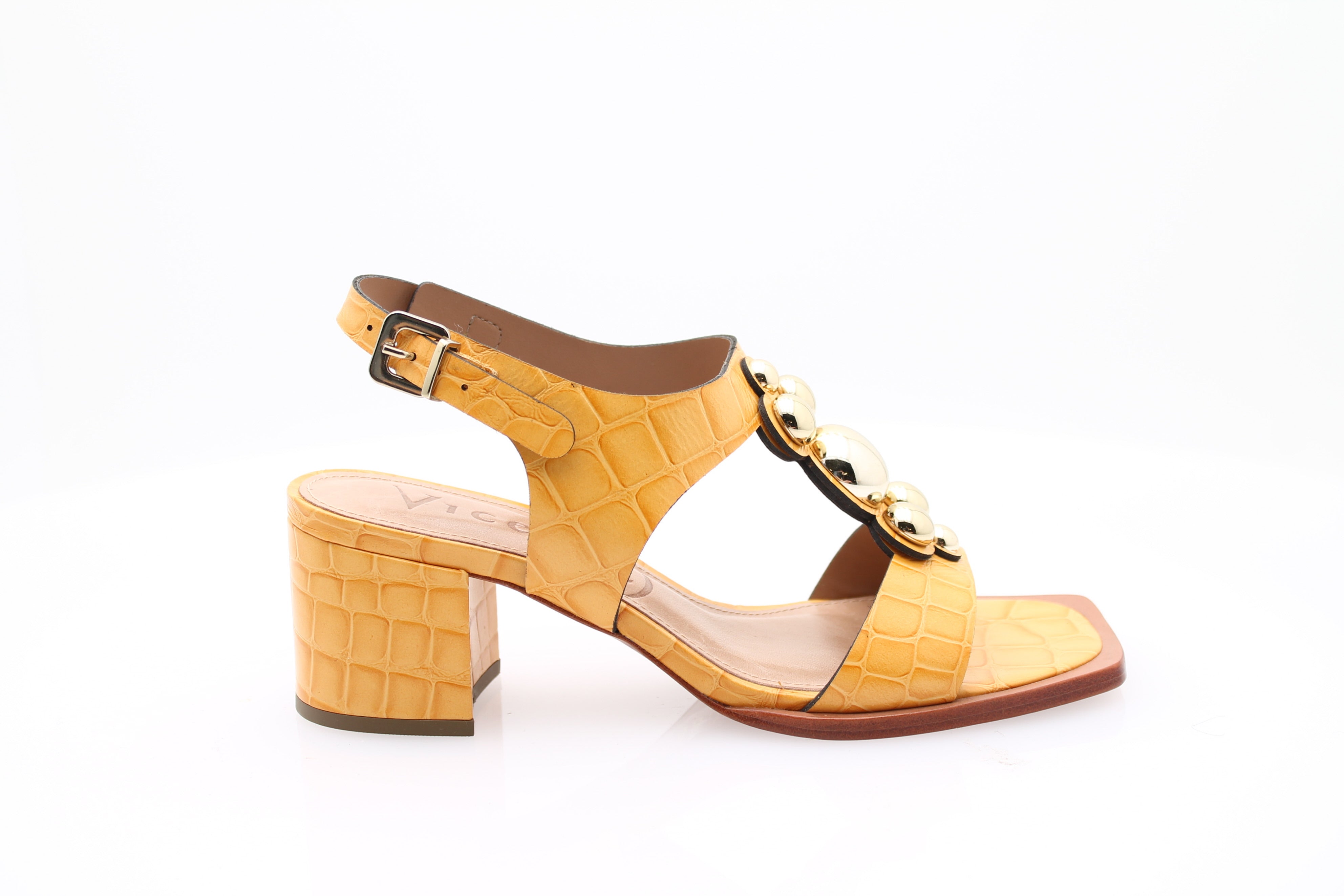 Avec leur cuir jaune lumineux, leur imprimé crocodile et leurs détails dorés, ces sandales Vicenza ajoutent une touche de glamour à chaque tenue. Elles sont parfaites pour une soirée élégante, une cérémonie estivale ou encore pour rehausser une tenue de bureau avec une note chic et audacieuse. Leur fermeture à boucle ajustable assure un maintien parfait, tout en sublimant délicatement la cheville.