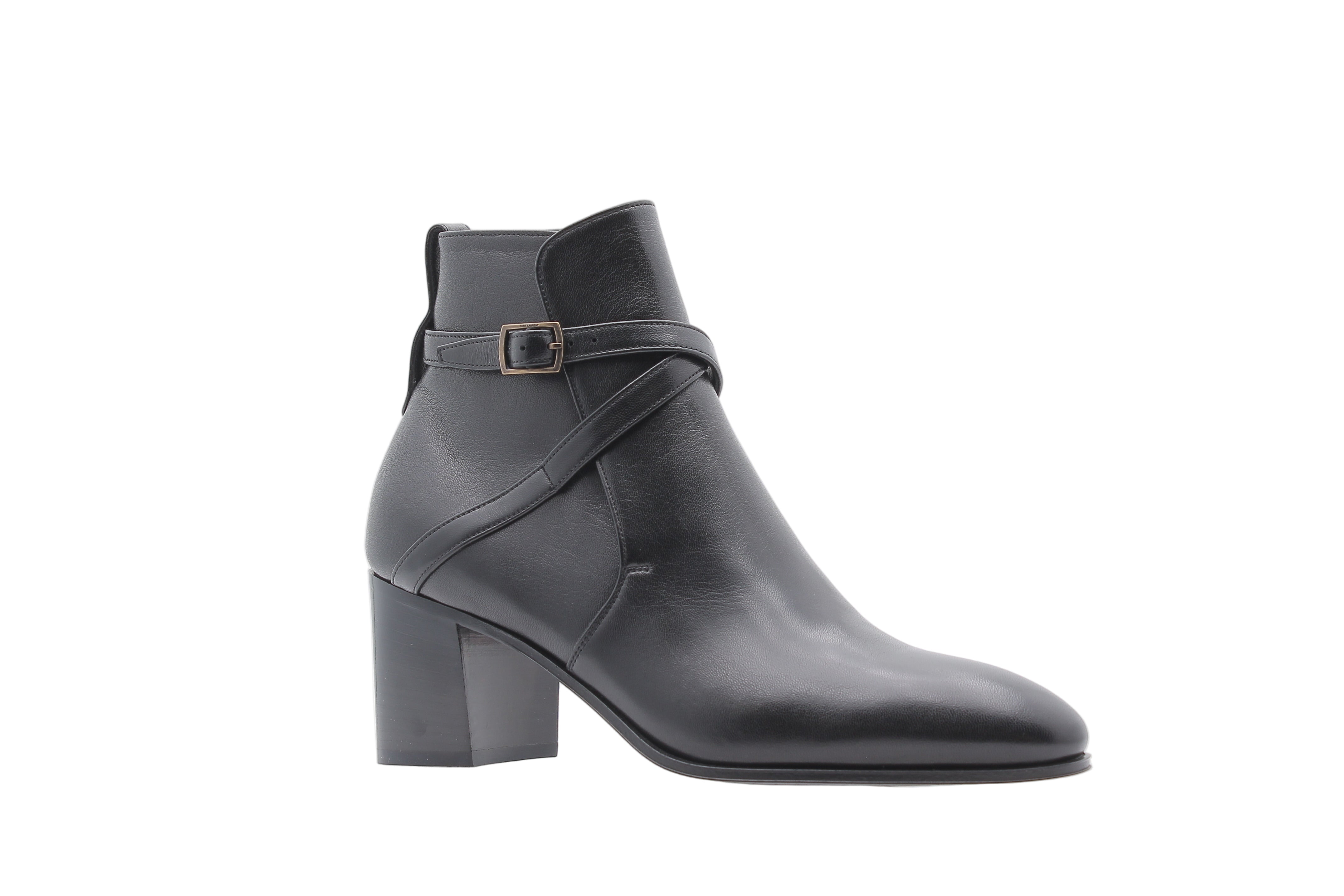 La Roma 70 Bootie de Saint Laurent incarne la fusion parfaite entre punk raffiné et esprit rock parisien. Conçue dans un cuir lisse noir éclatant, elle révèle une coupe épurée jusqu’à la cheville, rehaussée d’un bout amande intemporel. La chevillère croisée à boucles métalliques confère une note graphique audacieuse, affirmant une forte personnalité visuelle.
