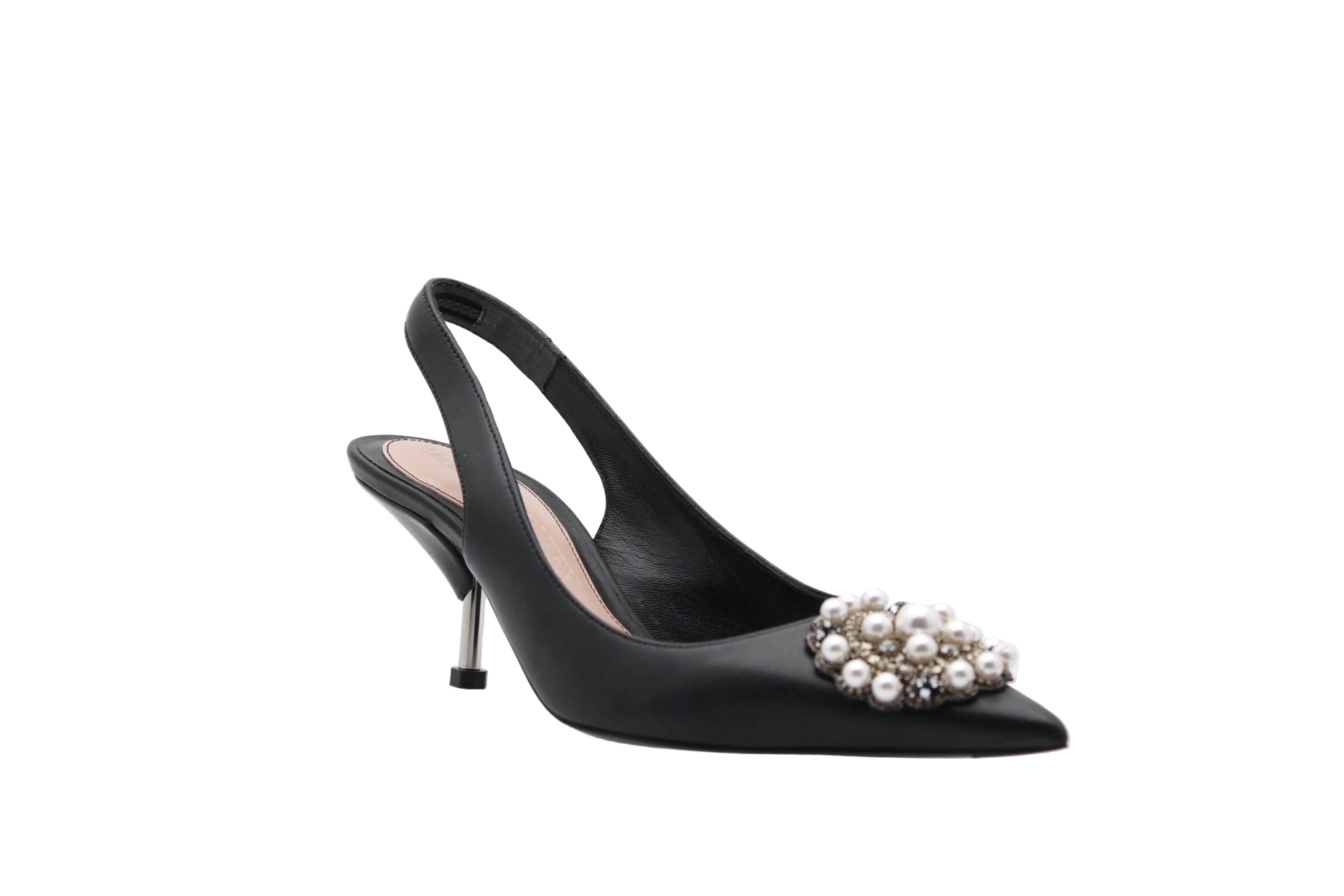 Ce modèle slingback repose sur un talon de 5 cm au design signature : fin, métallique et légèrement géométrique, offrant une allure moderne et sculpturale. À l’avant, un patch luxueux composé de perles blanches, cristaux et éléments argentés crée un jeu de lumière délicat, transformant l’escarpin en véritable bijou. La bride arrière élastiquée assure un maintien confortable tout en conservant une ligne épurée.