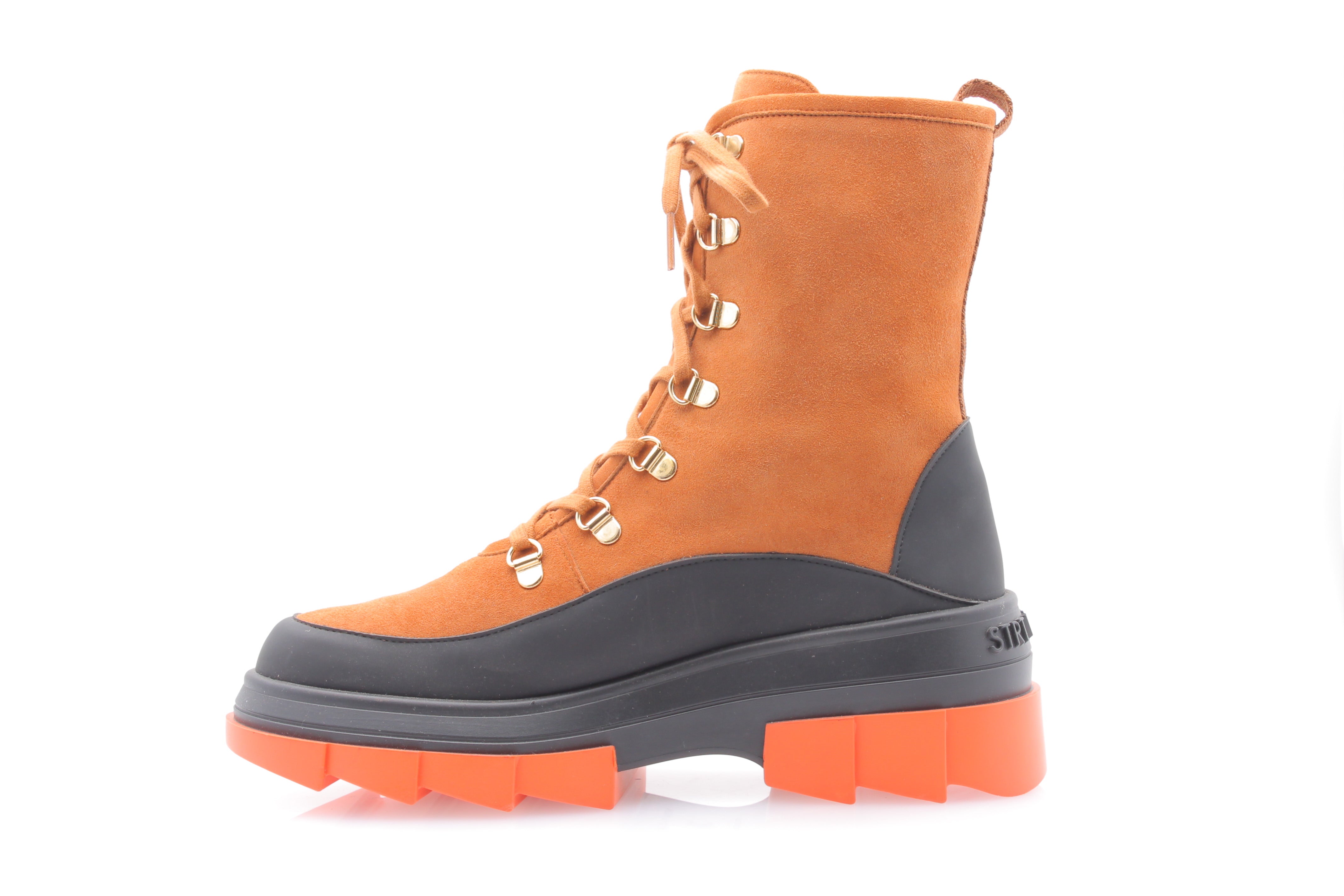 Avec la Noho Bootie, Stuart Weitzman signe une interprétation contemporaine de la bottine montante, mêlant l’esthétique workwear à une élégance structurée. Conçue en suède couleur nougat, elle séduit par ses lignes robustes et son jeu de contrastes entre la tige chaude et la semelle plateforme sculpturale. Les crochets dorés et le laçage renforcé évoquent l’esprit randonnée chic, parfait pour les exploratrices urbaines.